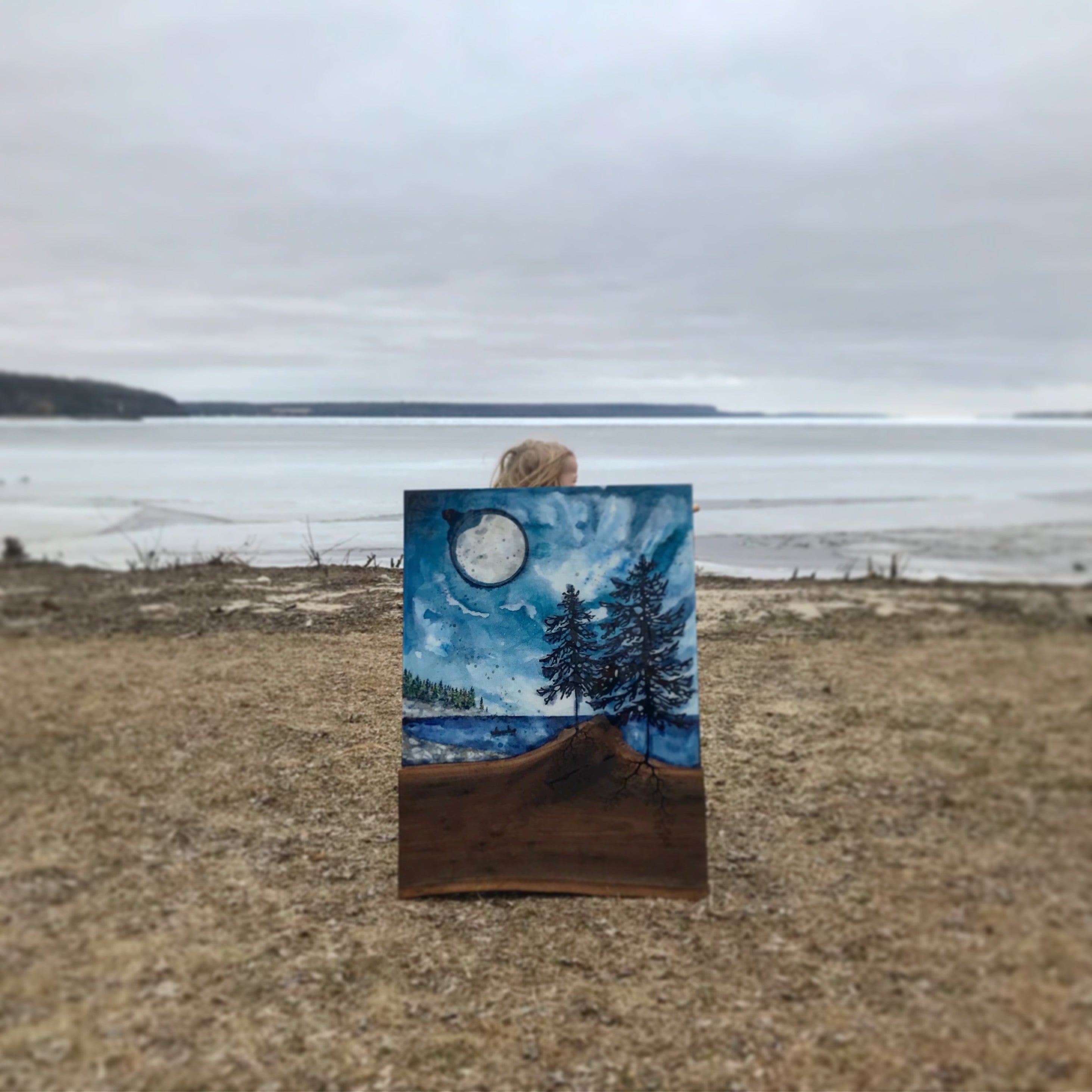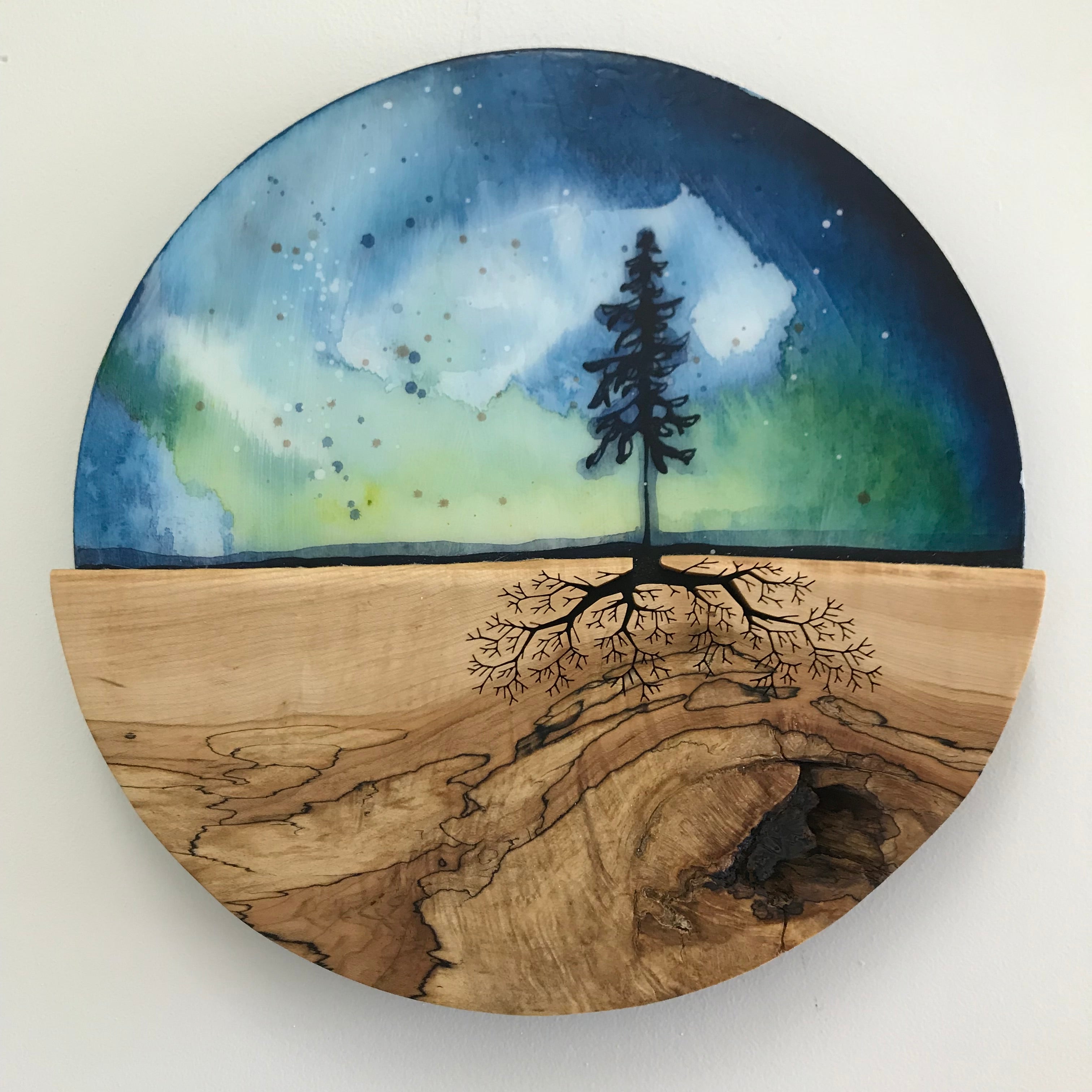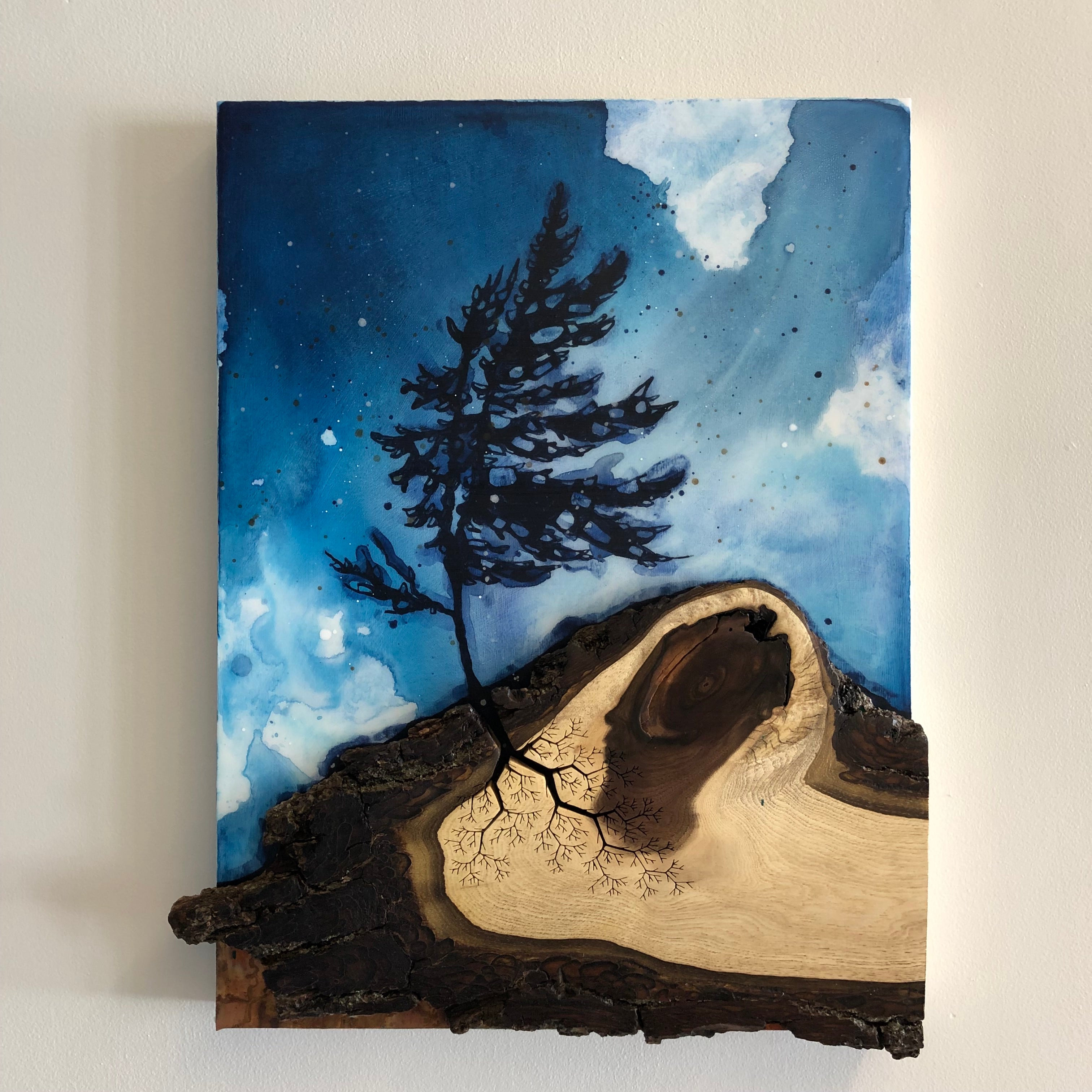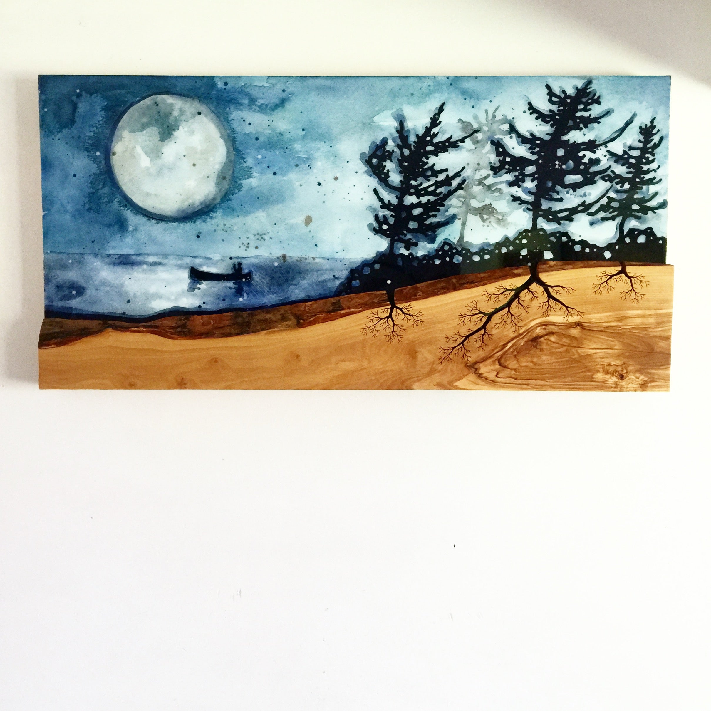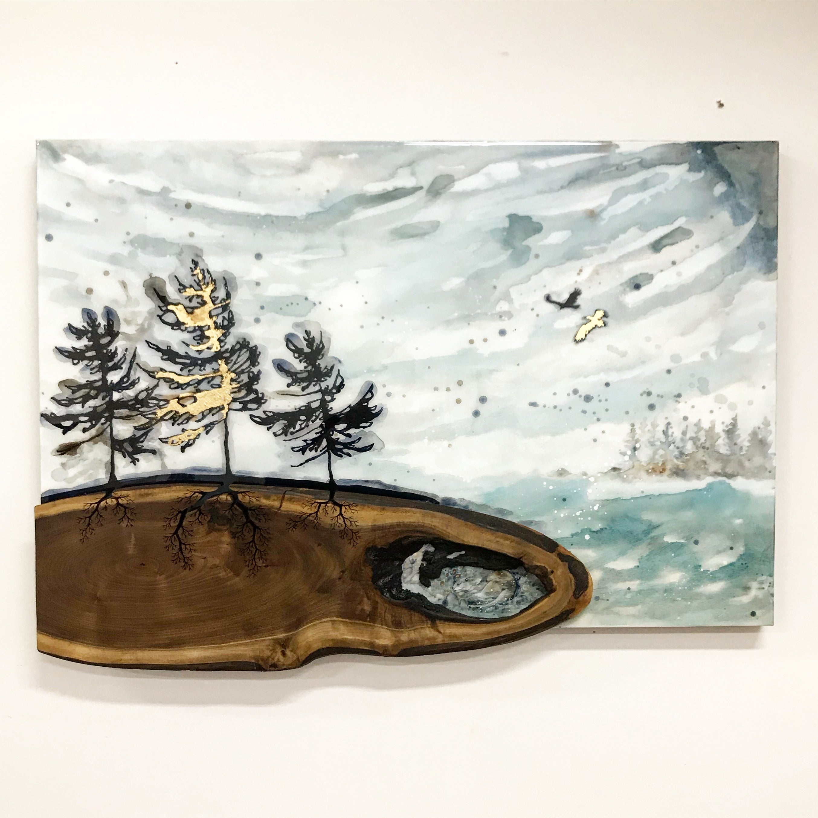 A design I had sketched as a tree growing from a piece of agate inset into the wood instead became the roots of the tree and became the catalyst for the idea of painting the tree above. We eventually moved away from the jewellery and accessories we initially created into making our distinctive wall art full time and travelling with it across Canada with the kids. We were so proud to have created an original artform together, one that sustained our family and animals.