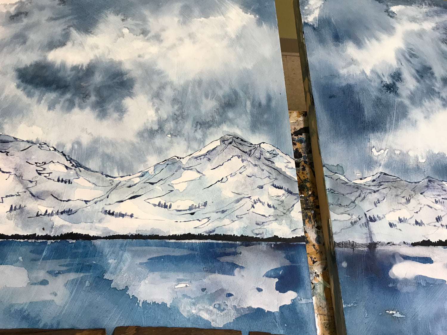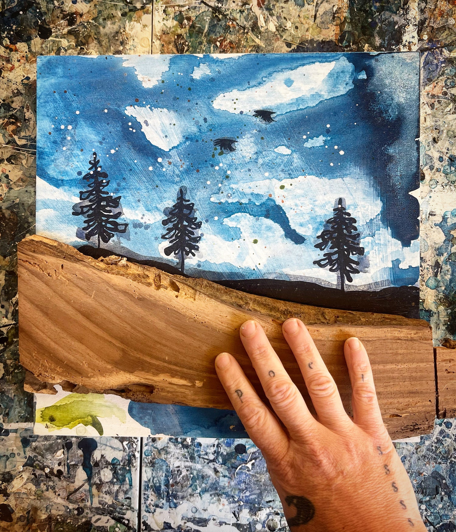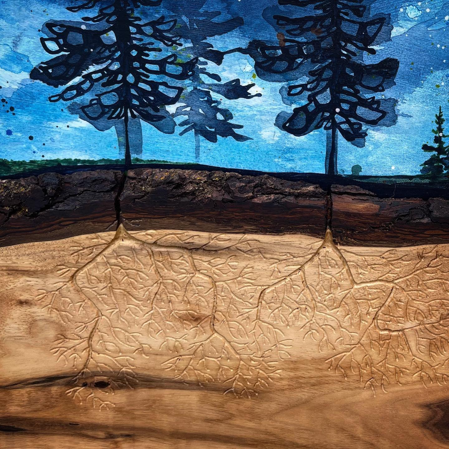 Each piece always has roots, the world below, and tree silhouettes, the world above. I use acrylics with lots of water and straight from the tube to shift between transparency and opaqueness in the world I create on a birch painting panel. Signature elements of my style are a blurred, watery outline to my trees and speckling, paint splatters in dark blue, sienna and white that for me, mimic the disintegration of memory, as captured in an old home movie.
