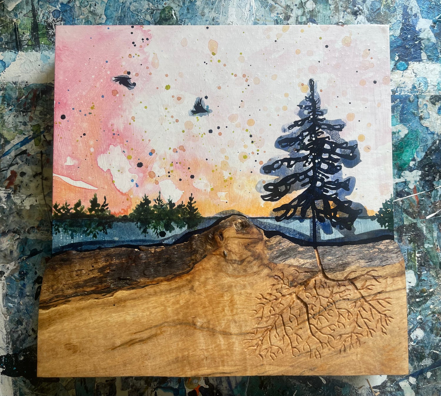 The characteristics of the wood will suggest a landscape to me. The wood becomes both the world beneath the soil through which the roots trace, and the defining line of the world that will rise above it. The shape of the wood and the grain will communicate the composition, rivers and lakes in the painting will flow in unison with the grain. While I tend to live within a range of blues, from melancholic, dream grey blue to super saturated indigo, the way that light hugs land and sea and the soft pinks of sunrise also flow from my paintbrush.
